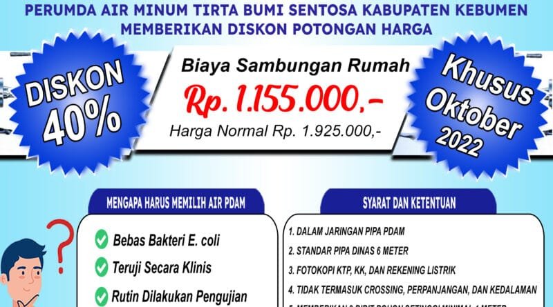 Baca SelengkapnyaKEBUMEN, Kebumen24.com – Perusahaan Air Minum Daerah Tirta Bumi Sentosa Kebumen kembali memberikan diskon sebesar 40% bagi calon pelanggan saluran